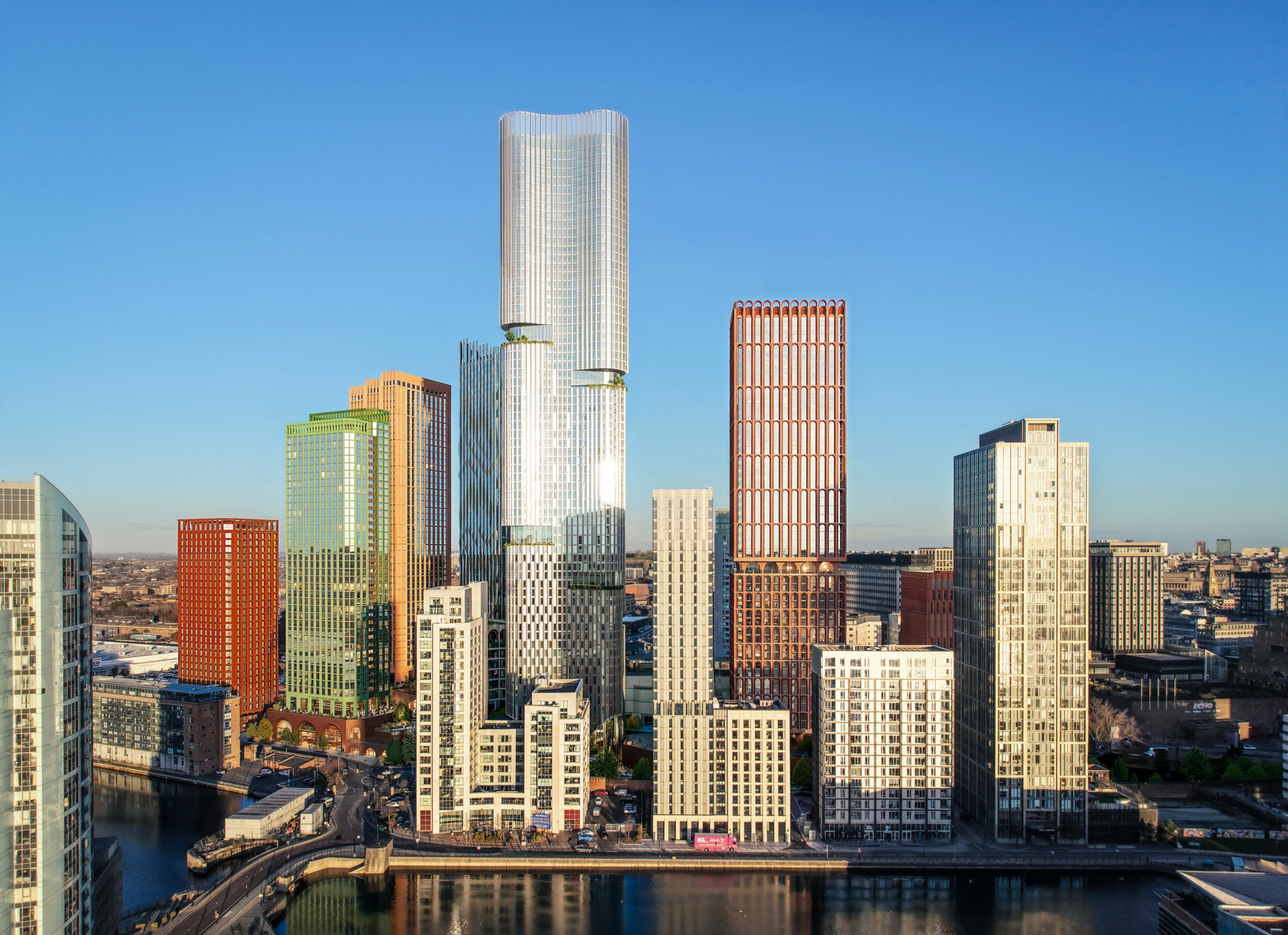 A defining feature of the masterplan will be a signature tower rising to over 60 storeys, set to become Liverpool’s tallest building and a new landmark on the Mersey skyline. Designed by Brock Carmichael, the wider masterplan establishes a series of towers and mid-rise buildings arranged around landscaped podium gardens, public plazas and active ground-floor streets.