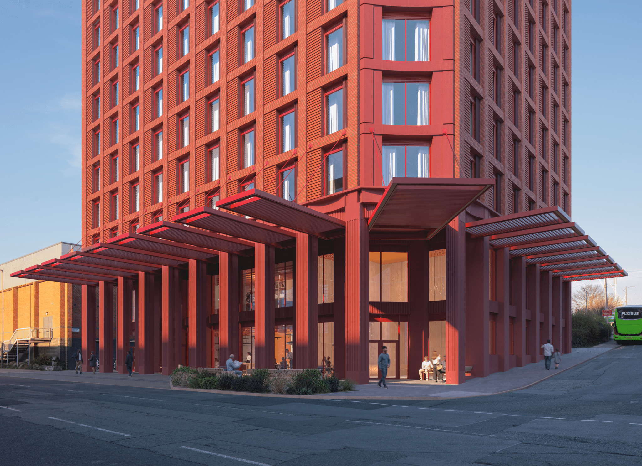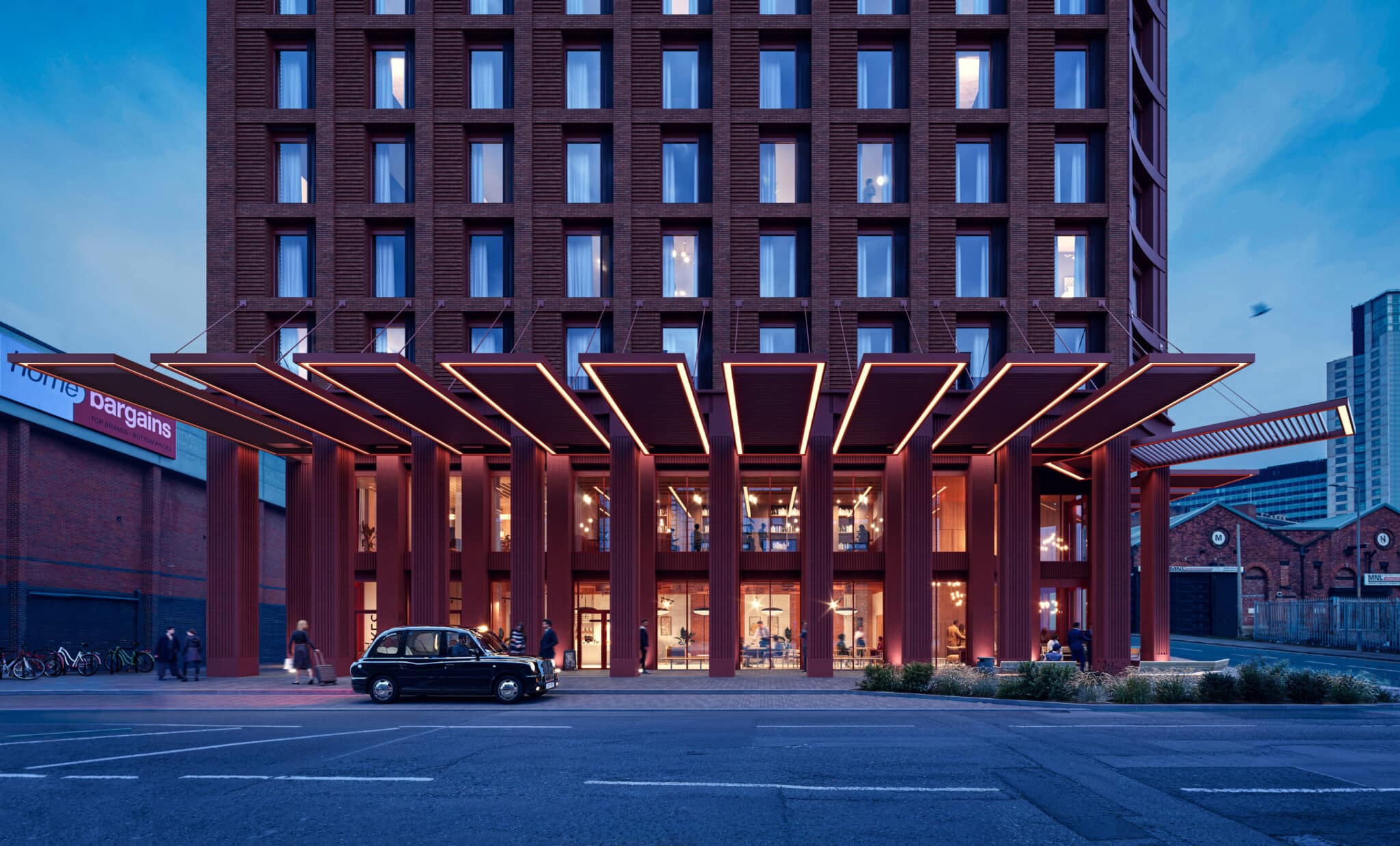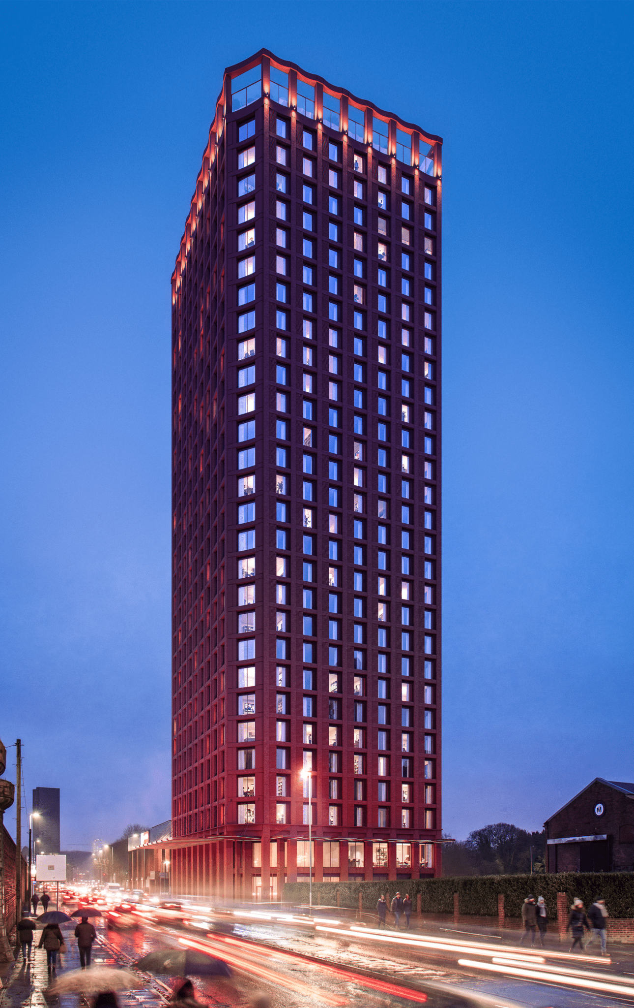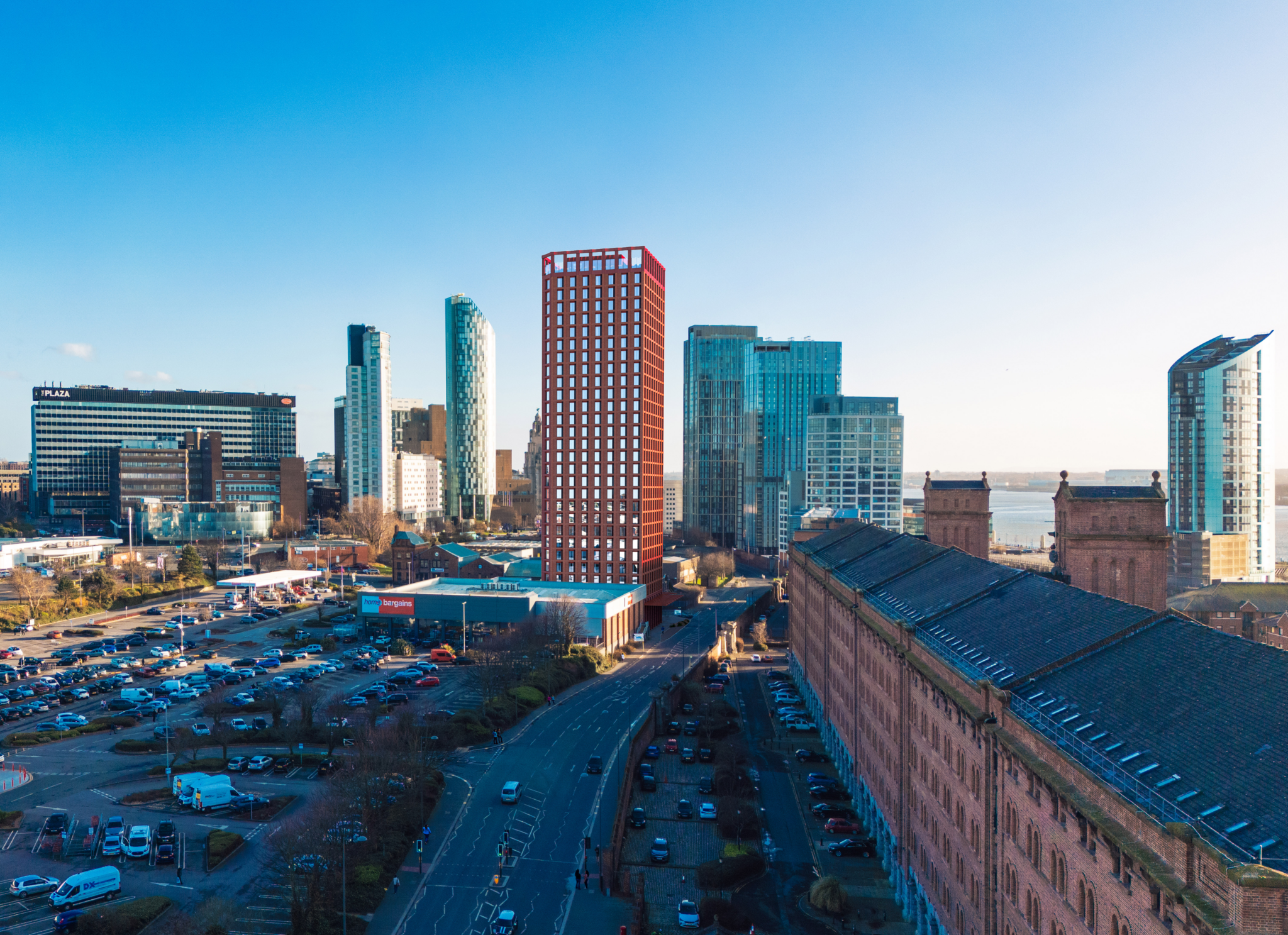 Its height and massing respond carefully to the surrounding context, sitting within the city’s growing tall building cluster near Princes Dock and mediating between existing towers and lower-scale neighbourhoods such as Ten Streets and Pumpfields. The design draws inspiration from Liverpool’s industrial dockland architecture, referencing historic materiality and fenestration patterns while delivering a contemporary residential building.